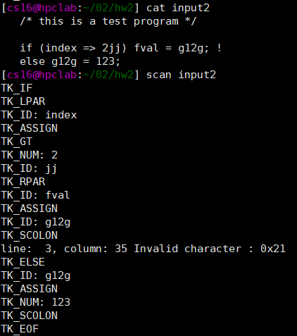if (argc != 2) { fprintf(stderr, "usage: %s <input>\n", argv[0]); exit(1) ; } if ((fin = fopen(argv[1], "r")) == NULL) { fprintf(stderr, "can't open %s\n", argv[1]); exit(1) ; } n = get_tok(); while (n != TK_EOF) { switch(n) { case TK_ID: printf("%s", "TK_ID: "); pc = yytext; for (i=0; i<yylen; i++) printf("%c", *pc++); printf("\n"); break; case TK_NUM: printf("%s", "TK_NUM: "); printf("%d\n", yylval); break; case TK_IF: printf("%s\n", "TK_IF"); break; case TK_ELSE: printf("%s\n", "TK_ELSE"); break; case TK_ASSIGN: printf("%s\n", "TK_ASSIGN"); break; case TK_EQ: printf("%s\n", "TK_EQ"); break; case TK_NE: printf("%s\n", "TK_NE"); break; case TK_GT: printf("%s\n", "TK_GT"); break; case TK_GE: printf("%s\n", "TK_GE"); break; case TK_LT: printf("%s\n", "TK_LT"); break; case TK_LE: printf("%s\n", "TK_LE"); break; case TK_LPAR: printf("%s\n", "TK_LPAR"); break; case TK_RPAR: printf("%s\n", "TK_RPAR"); break; case TK_SCOLON: printf("%s\n", "TK_SCOLON"); break; } n = get_tok(); } printf("%s\n", "TK_EOF"); fclose(fin); } |