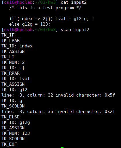 n = yylex(); while (n) { switch(n) { case TK_ID: printf("%s", "TK_ID: "); c = yytext; for (i=0; i<yylen; i++) printf("%c", *c++); printf("\n"); break; case TK_NUM: printf("%s", "TK_NUM: "); printf("%d\n", yylval); break; case TK_IF: printf("%s\n", "TK_IF"); break; case TK_ELSE: printf("%s\n", "TK_ELSE"); break; case TK_ASSIGN: printf("%s\n", "TK_ASSIGN"); break; case TK_EQ: printf("%s\n", "TK_EQ"); break; case TK_NE: printf("%s\n", "TK_NE"); break; case TK_GT: printf("%s\n", "TK_GT"); break; case TK_GE: printf("%s\n", "TK_GE"); break; case TK_LT: printf("%s\n", "TK_LT"); break; case TK_LE: printf("%s\n", "TK_LE"); break; case TK_LPAR: printf("%s\n", "TK_LPAR"); break; case TK_RPAR: printf("%s\n", "TK_RPAR"); break; case TK_SCOLON: printf("%s\n", "TK_SCOLON"); break; } n = yylex(); } printf("%s\n", "TK_EOF");