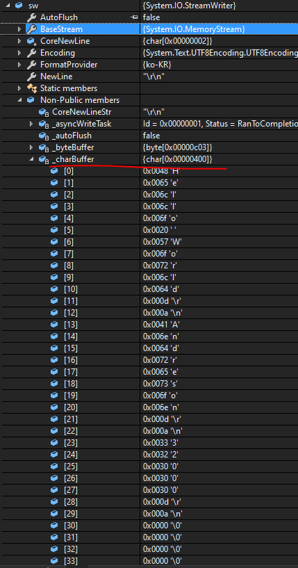 여기서 중요한 것은 StreamWriter와 BinaryWriter의 flush() 후 MemoryStream에 담긴 값이 다르다.