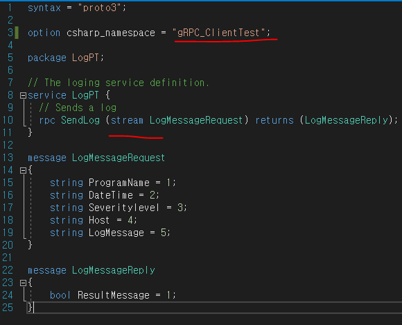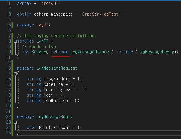 public override async Task<LogMessageReply> SendLog(IAsyncStreamReader<LogMessageRequest> requestStream, ServerCallContext context) // 스트림 형식 request