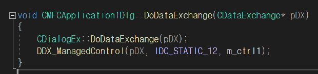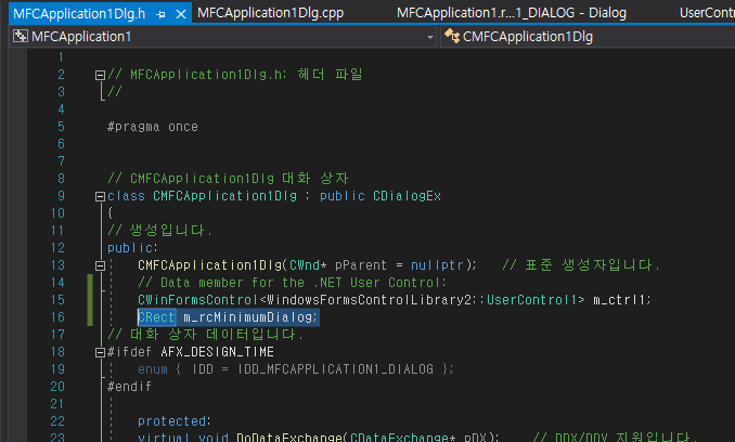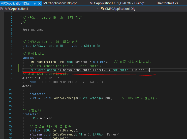 12. MFCApplication1Dlg.h 에 CWinFormsControl<WindowsFormsControlLibrary2::UserControl1> m_ctrl1; 추가