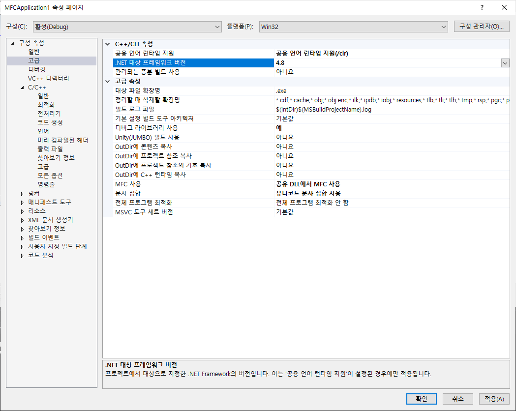 8. 공용 언어 런타임 지원 및 프레임워크 4.8 수정 (프로젝트 속성 - 구성 속성 - 고급 - 공용 언어 런타임 지원)