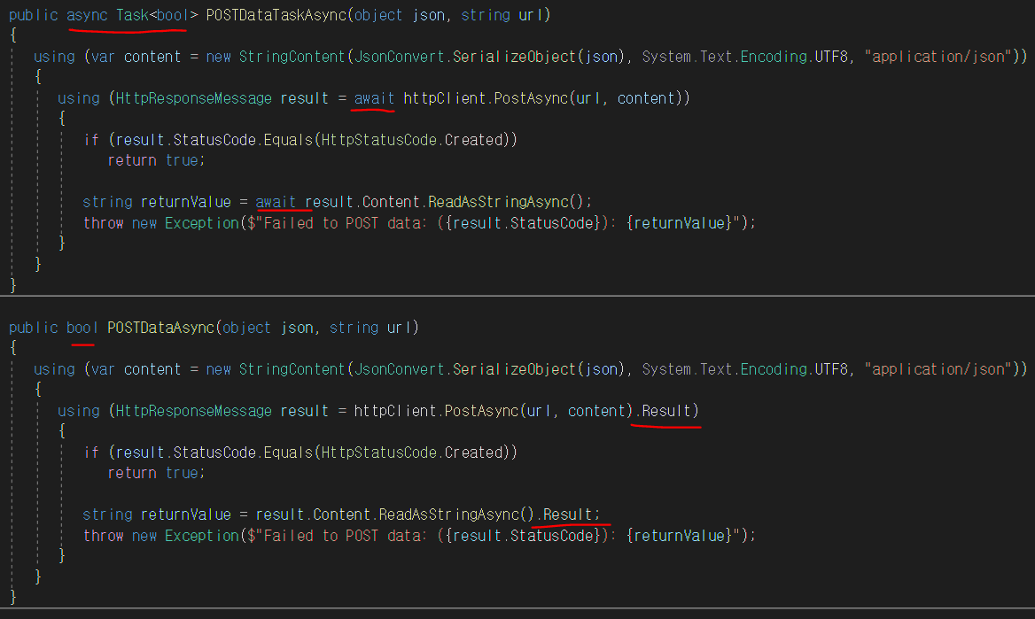 c# - Await vs Task.Result in an Async Method - Stack Overflow c# - How does Task become an int? - Stack Overflow 이 질문과 비슷하게 async task에서 await와 그냥 void에서 task.result의 차이를 위 링크에서 읽어봤는데 잘 이해가
