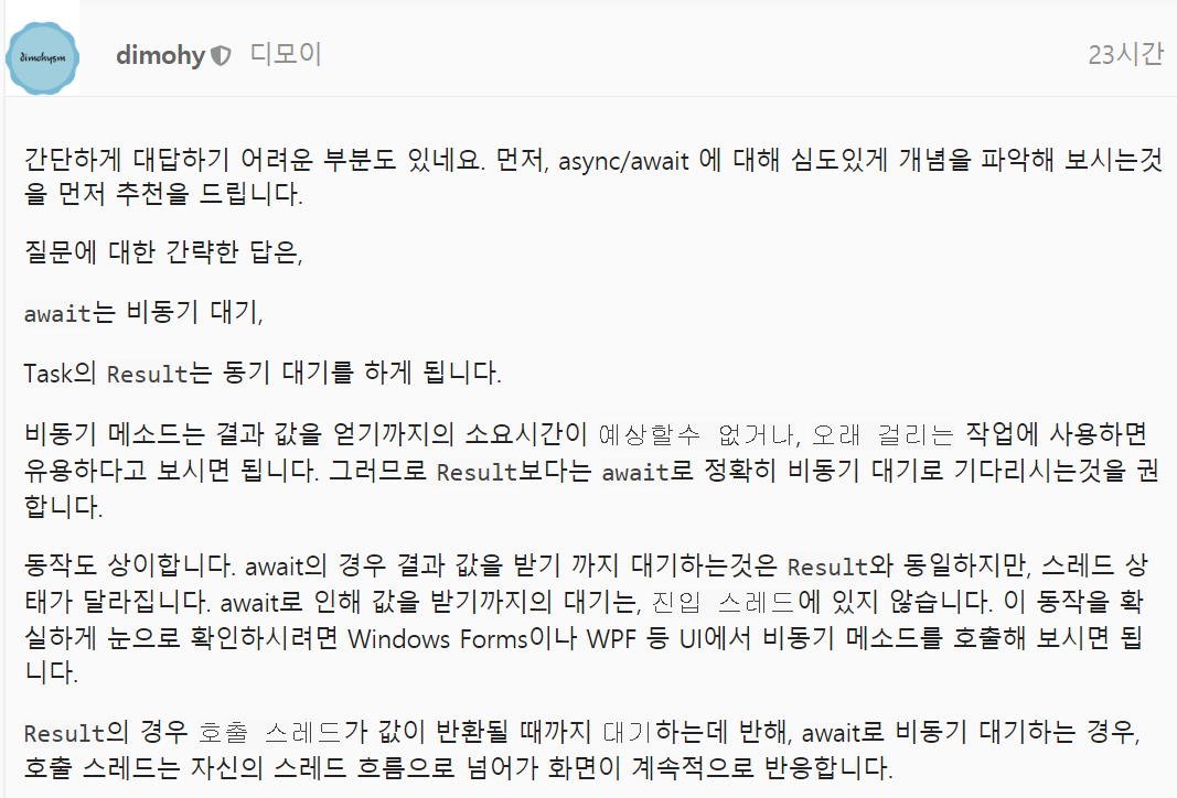 Await 와 result의 차이 질문 - ⁉️ .NET Overflow (Q&A) - 닷넷데브 (dotnetdev.kr)