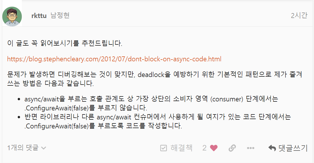 이 글도 꼭 읽어보시기를 추천드립니다. https://blog.stephencleary.com/2012/07/dont-block-on-async-code.html 문제가 발생하면 디버깅해보는 것이 맞지만, deadlock을 예방하기 위한 기본적인 패턴으로 제가 즐겨