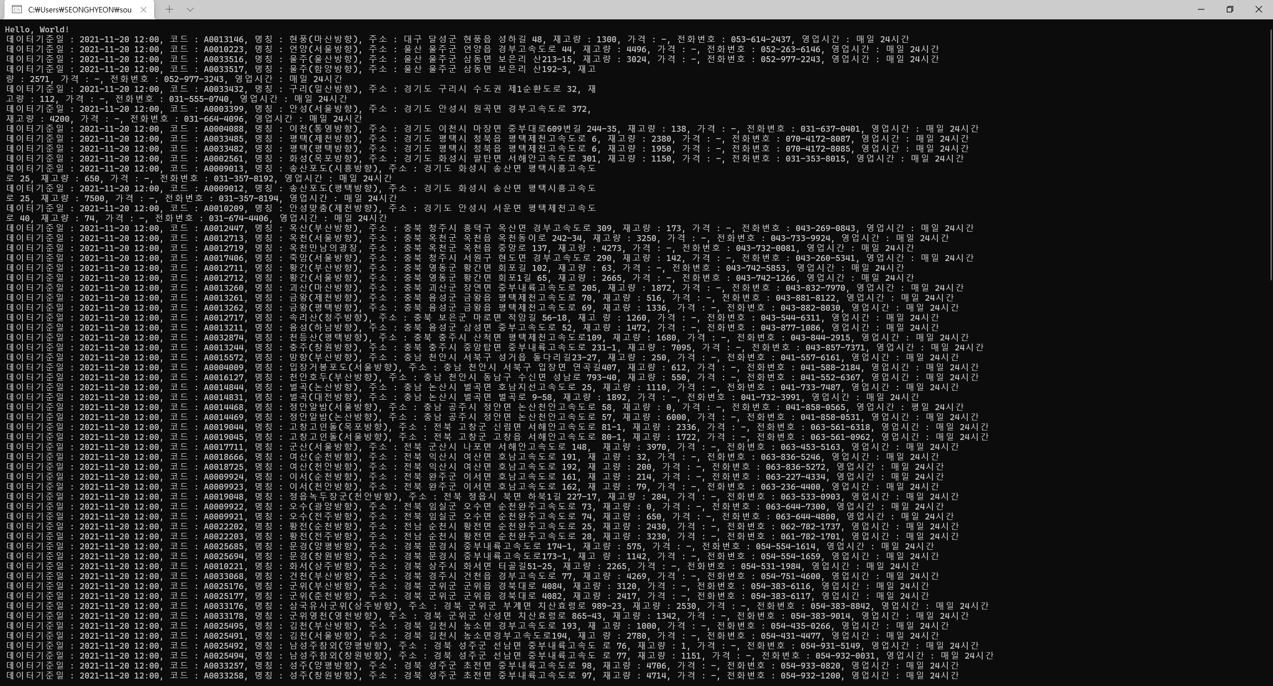 public override string ToString() => $"데이터기준일 : {데이터기준일}, 코드 : {코드}, 명칭 : {명칭}, 주소 : {주소}, 재고량 : {재고량}, 가격 : {가격}, 전화번호 : {전화번호}, 영업시간 : {영업시간}{Environment.NewLine}";