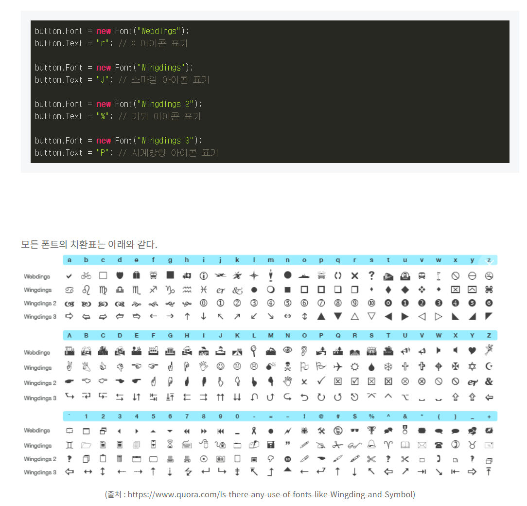 WindowsForms를 개발하다보면, 필연적으로 마주치는 상황이 생긴다. 타이틀바의 최소화, 최대화, 닫기 버튼 이라든지.. 뮤직플레이어의 재생, 정지 버튼이라든지.. 버튼의 텍스트를 아이콘으로 표현