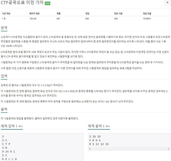 #include <iostream>using namespace std;int main(){int testcase, m, j;char alp;int arr1[501];char arr2[501];cin >> testcase;for (j = 0; j < testcase; j++){cin >> m >> alp;if (alp == 'C'){for (int i = 0; i < m; i++){cin >> arr2[i];}for (int i = 0; i < m; i++)printf("%d ", arr2[i]-64);}else if (alp == 'N'){for (int i = 0; i < m; i++){cin >> arr1[i];}for (int i = 0; i < m; i++)printf("%c ", arr1[i]+64);}cout << endl;}return 0;}