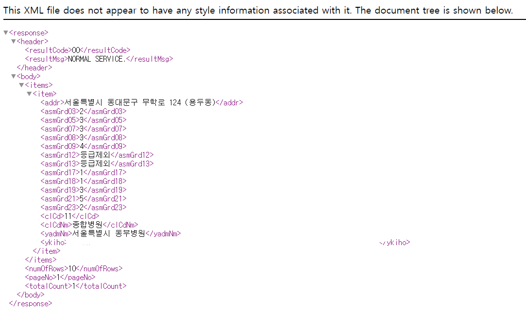 - numOfRows가 한페이지당 결과 수인데 totalCount가 작다면 데이터가 끝.